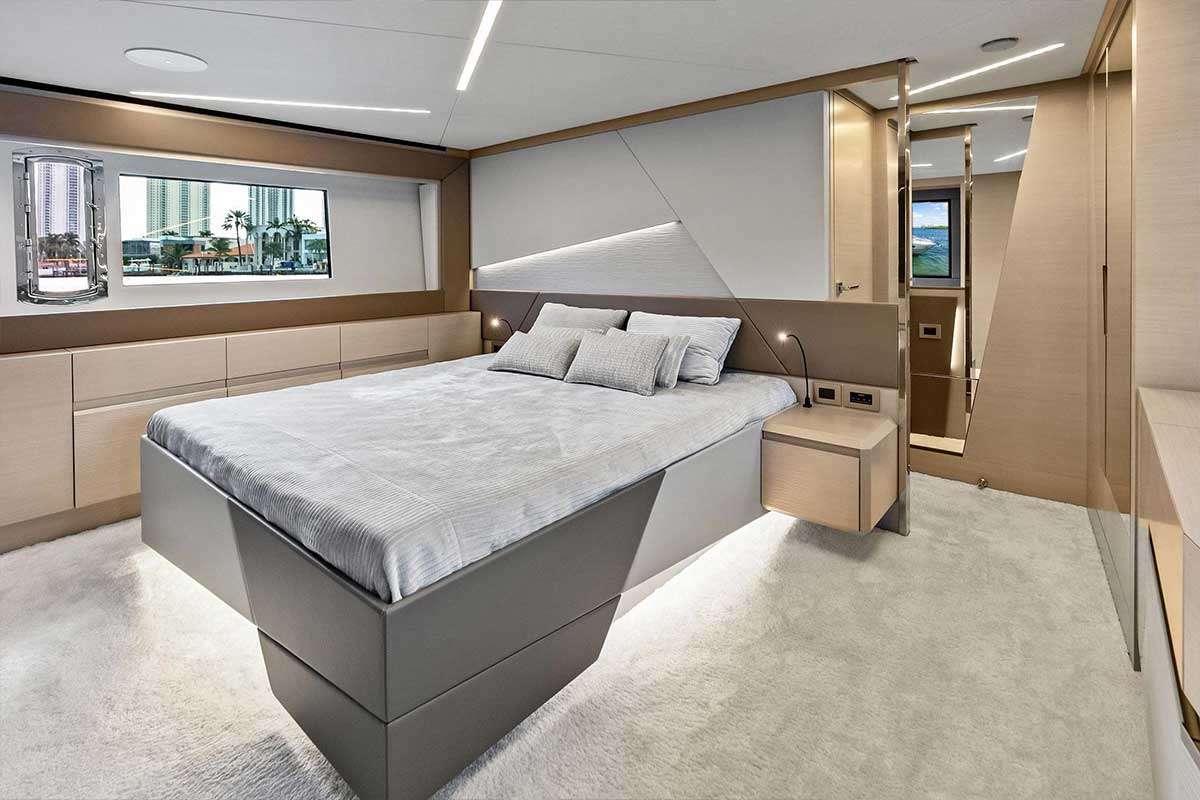 The lightness of the Pershing 7X takes the forms and textures of the carbon fibre widely used in its construction. With its typical sleek, sporty lines, the exterior design brings major aesthetic innovations to the Pershing style, starting with the brand-new color of the hull and superstructure. The attractive shapes are carried over in the interiors, designed to ensure
